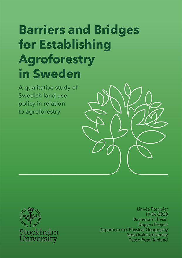 Två nya examensarbeten om agroforestry har publicerats med fokus på policy ”Barriers and Brides for Establishing Agroforestry. A qualitative study of Swedish land use policy in relation to agroforestry”. Författare: Linnéa Pasquier. ”The potentials of agroforestry systems in Denmark and southern Sweden – A comparative study on farmers perceptions and agroforestry-related policies”. Författare: Carolina Yang.